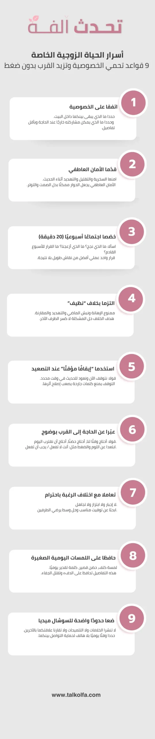 الحياة الزوجية “الخاصة” مو معناها جانب واحد فقط. هي مساحة كاملة خلف الأبواب: حدود واضحة، أمان عاطفي، طريقة خلاف محترمة، وقرب يتبنى على رضا الطرفين. وفي هذا الدليل رح ناخدها عملياً: قواعد مختصرة، جُمل جاهزة للحوار، وتمارين صغيرة قابلة للتطبيق… بدل النصائح العامة اللي بتتكرر بكل مكان.