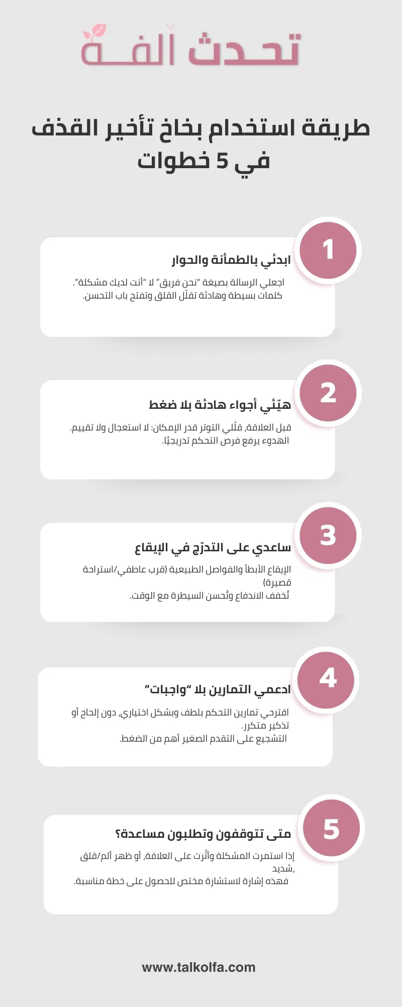 قبل أن نبدأ بالخطوات السبعة، إذا كنت تريد صورة أشمل عن الخيارات المتاحة (الطبية والمنزلية وما يناسب كل حالة)، يمكنك الرجوع إلى دليلنا الأساسي: علاج سرعة القذف: الدليل الشامل—ثم عُد هنا لنطبّق معًا ما يمكن للزوجة فعله عمليًا، خطوة بخطوة، بدون إحراج ولا مبالغة.
