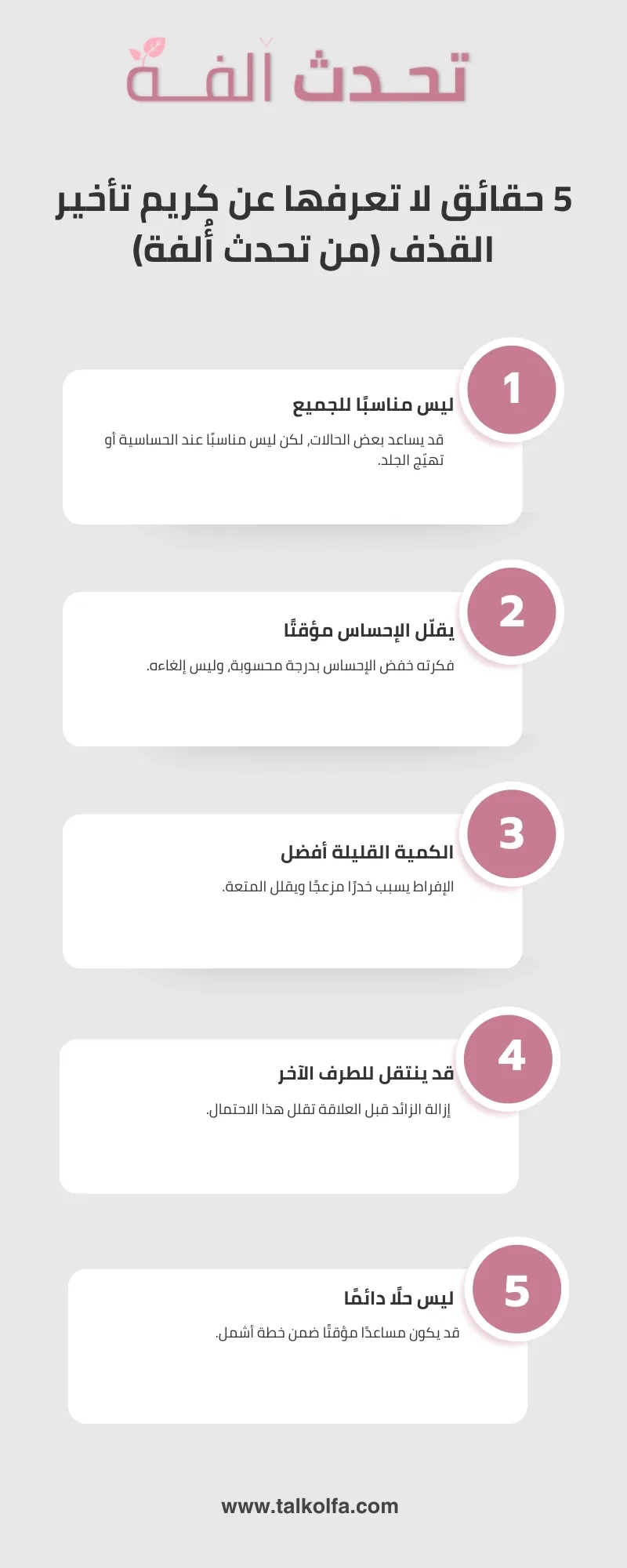 ليس كل من يبحث عن “كريم تأخير القذف” سيستفيد منه بنفس الطريقة، لأن الفكرة الأساسية للكريم هي تقليل الإحساس بشكل مؤقت. لذلك قد يكون مناسبًا في حالات محددة، وغير مناسب أو يحتاج حذرًا في حالات أخرى.