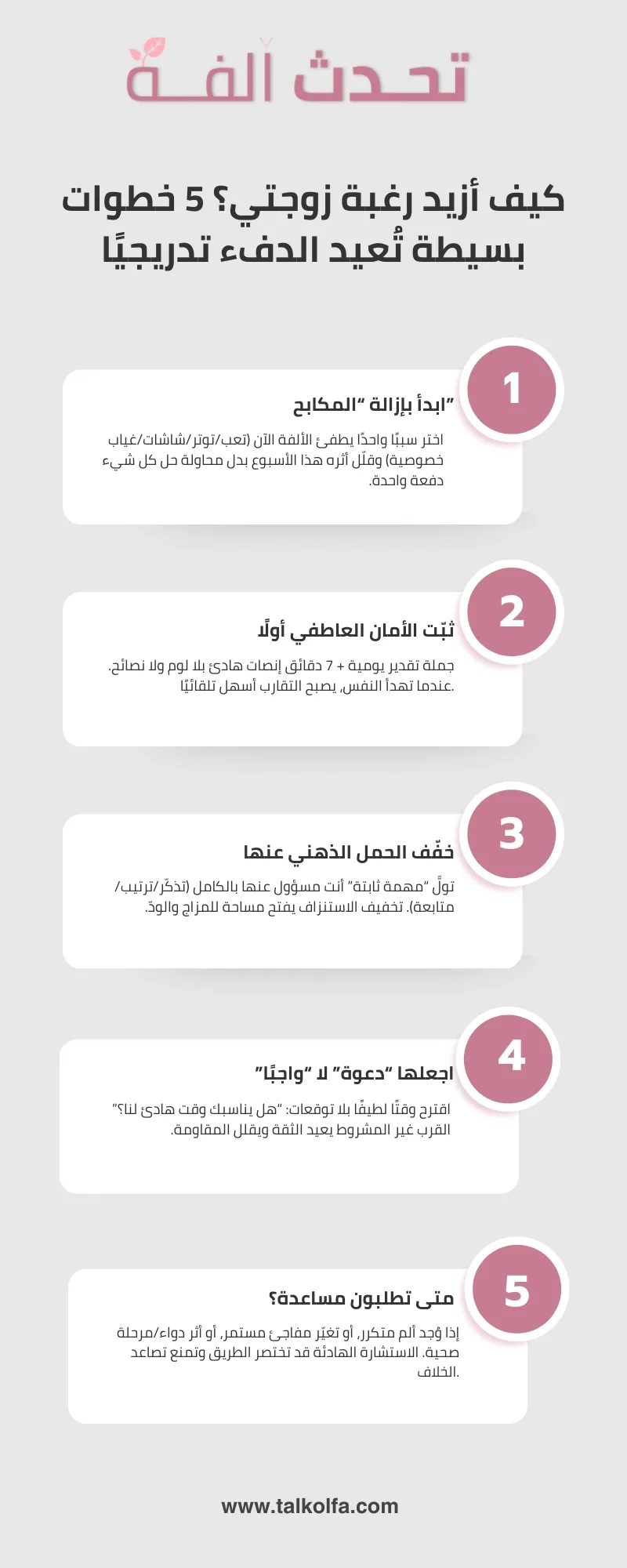 إذا كان سؤالك الأساسي هو: كيف أزيد رغبة زوجتي؟ فالإجابة غالبًا ليست في “محفزات أكثر”، بل في سياق أفضل: تخفيف المكابح (التعب والتوتر)، بناء الأمان العاطفي، وعدالة الحمل الذهني، ثم وقت هادئ وتدرّج بلا ضغط.